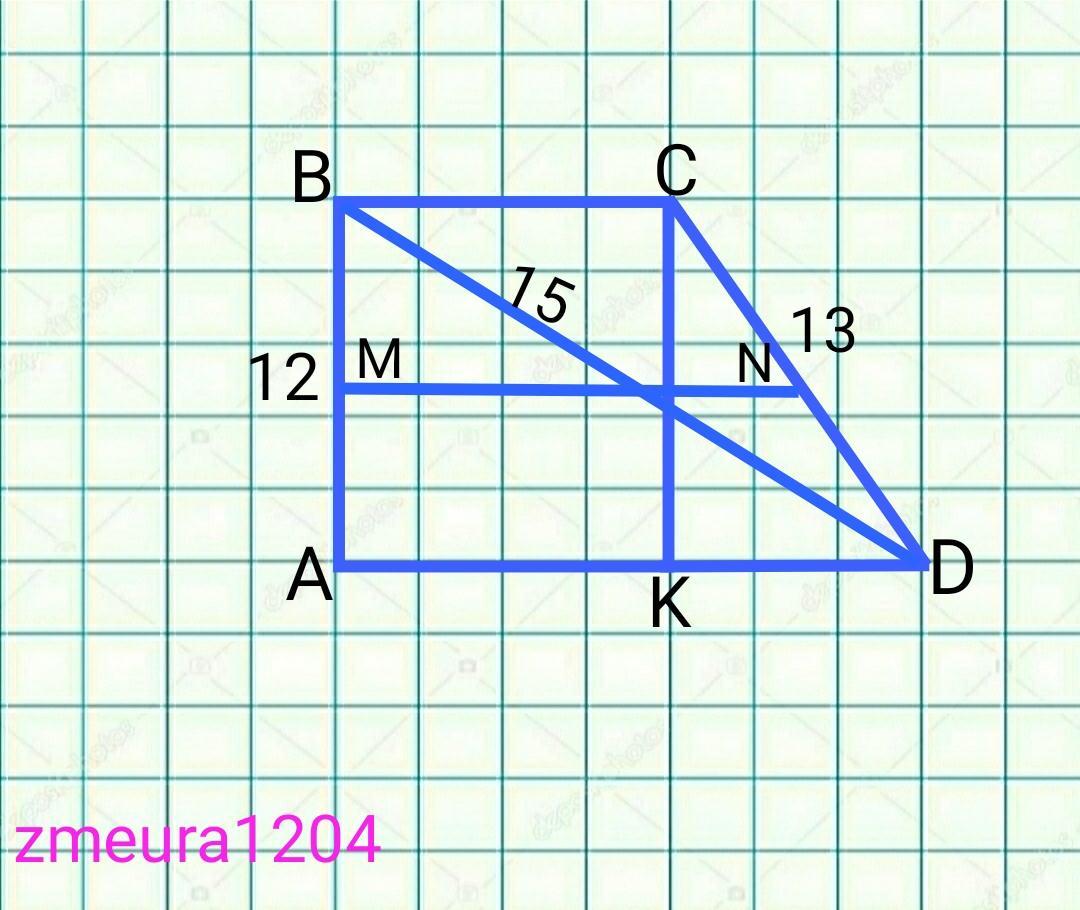 Допоможіть!!! . 3. В прямокутній трапеції більша діагональ дорівнює 15 см, а бічні сторони - 12 см і 13 см. Знайти середню лінію трапеції.