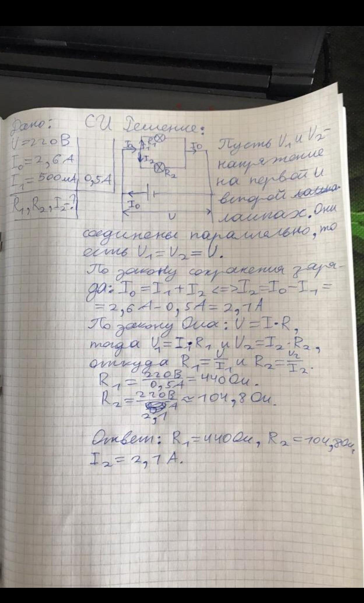Две лампы соединены параллельно .Наприжение на первой лампе 220В сила тока в ней 0,5 Сила тока в цепи 2,6А