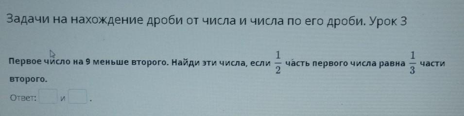 Первое число на 9 меньше второго. Найди эти числа, если часть первого числа равна 2 3 второго. Ответ: ........ и ....... ПОМОГИТЕ ПОЖАЛУЙСТА
