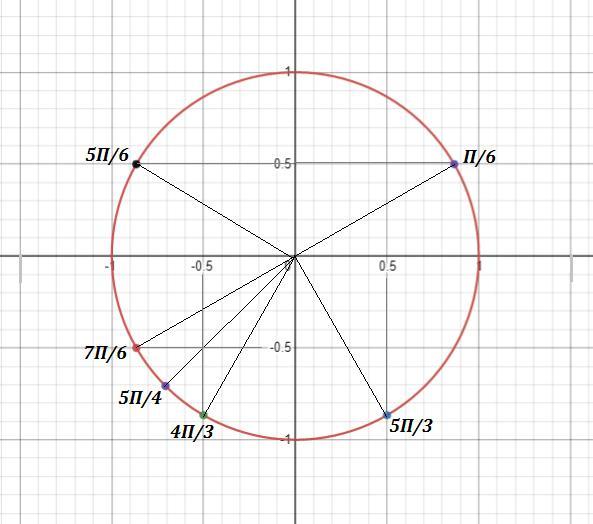 Точки отмечены на единичной окружности, возле точек написаны соответствующие радианы углов .