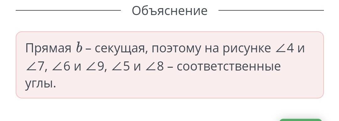 Параллельные прямые, их признаки и свойства. Урок 1 Верных ответов: 3 ∠2 и ∠7 ∠6 и ∠9 ∠4 и ∠7 ∠3 и ∠9 ∠5 и ∠8 ∠1 и ∠4