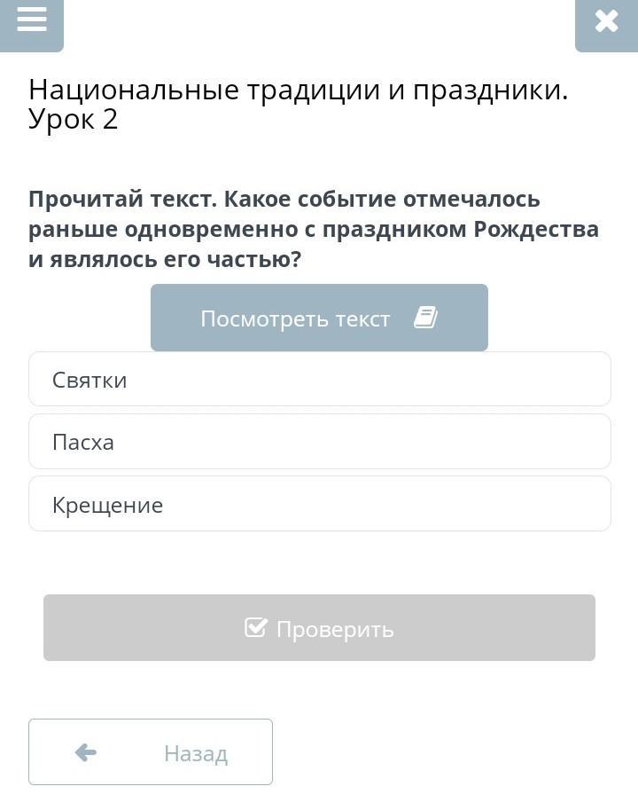 Национальные традиции и праздники. Урок 2 Прочитай текст. Какое событие отмечалось раньше одновременно с праздником Рождества и являлось его частью? Посмотреть текст Святки Пасха Крещение Назад Проверить