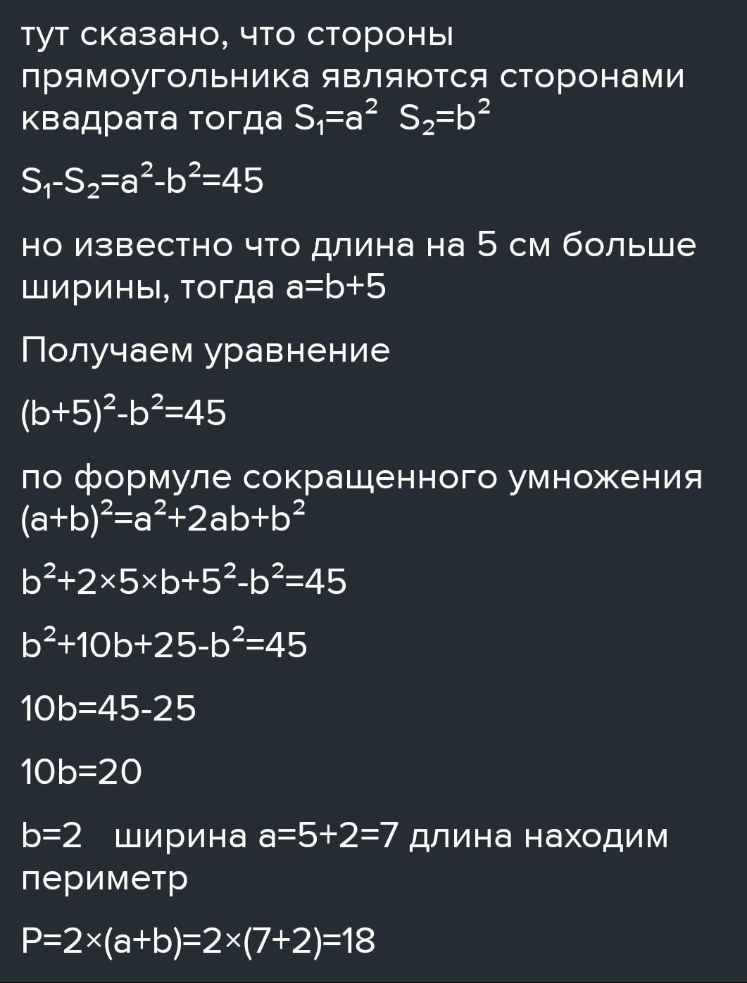 Дан прямоугольник со сторонами а b. На его сторонах построены квадраты. Площадь одного квадрата на 45 см2 меньше площади другого. Найди периметр прямоугольника, если длина прямоугольника на 5 см больше его ширины.