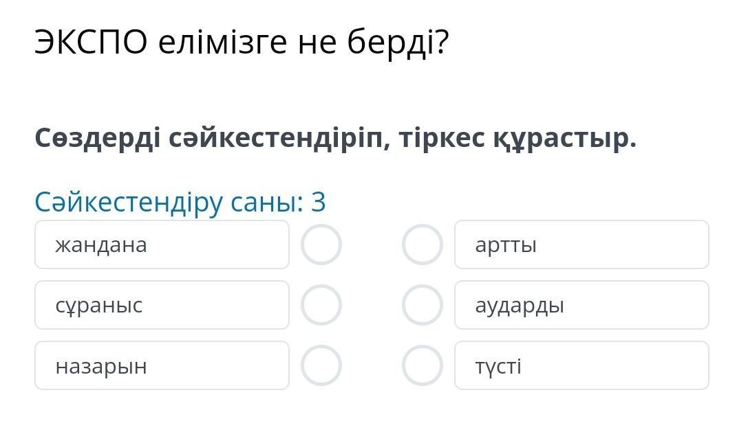 Сөздерді сәйкестендiрiп, тіркес құрастыр. Сәйкестендіру саны: 3 жандана сұраныс артты аударды назарын түсті