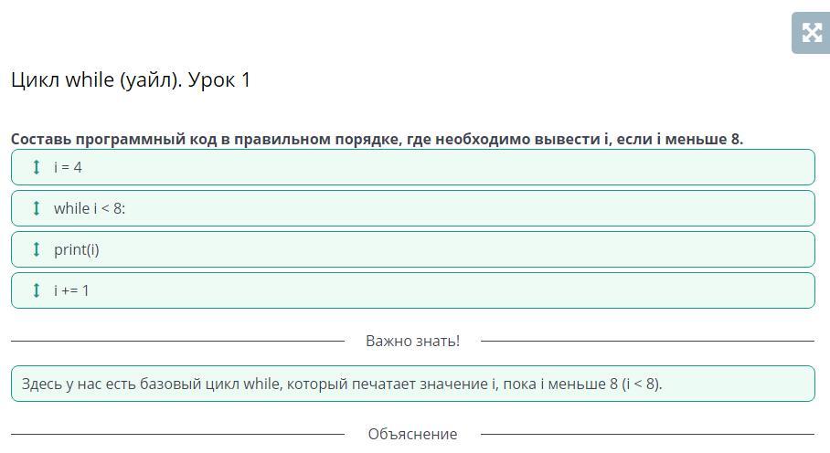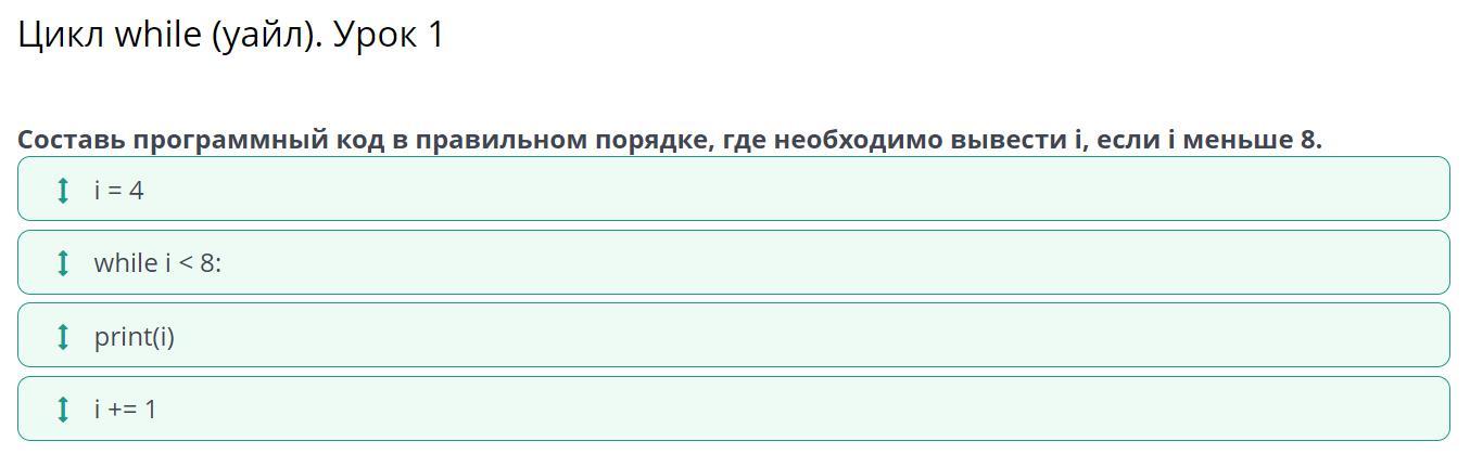 составьте програмный код в правильном порядке необходимо ввести i ,если i меньше 8.
