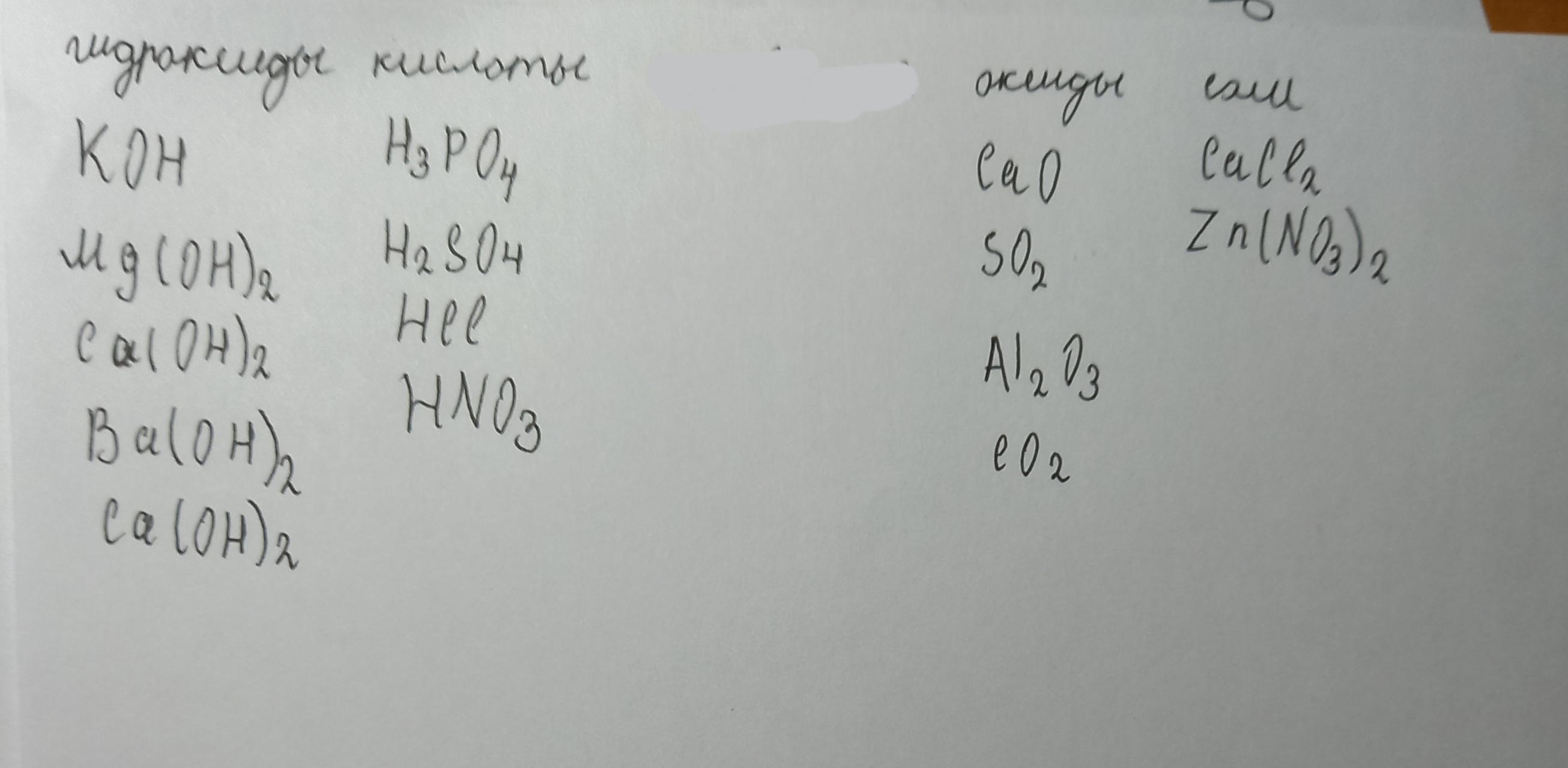 Вещества: CaO, H3PO4, KOH, SO2, H2SO4, CuCl2,Mg(OH)2, HCI, Cu(OH)2, Zn(NO3)2, Ba(OH)2, HNO3, Al2O3, Ca(OH)2, CO2.