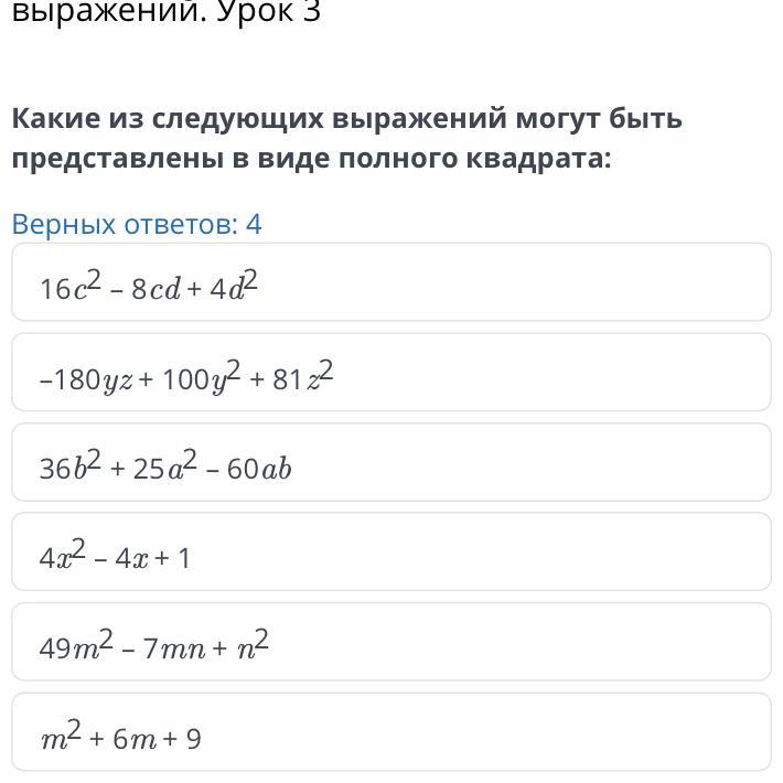 Какие из следующих выражений могут быть представлены в виде полного квадрата: