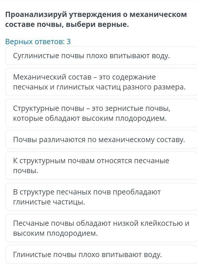 Проанализируй утверждения о механическом составе почвы, выбери верные. верных ответов: 3 суглинистые почвы плохо впитывают воду. механический состав - это содержание песчаных и глинистых частиц разного размера. структурные почвы - это зернистые почвы, которые обладают высоким плодородием. почвы различаются механическому составу. к структурным почвам относятся песчаные почвы. в структуре песчаных почв преобладают глинистые частицы. песчаные почвы обладают низкой клейкостью и высоким плодородием. глинистые почвы плохо впитывают воду.