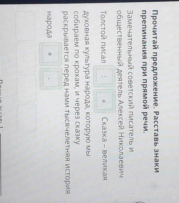 Прочитай предложение. Расставь знаки препинания при прямой речи. Замечательный советский писатель и общественный деятель Алексей Николаевич Толстой писал 3 Сказка – великая духовная культура народа, которую мы собираем по крохам, и через сказку раскрывается перед нами тысячелетняя история народа + « Т. Е: