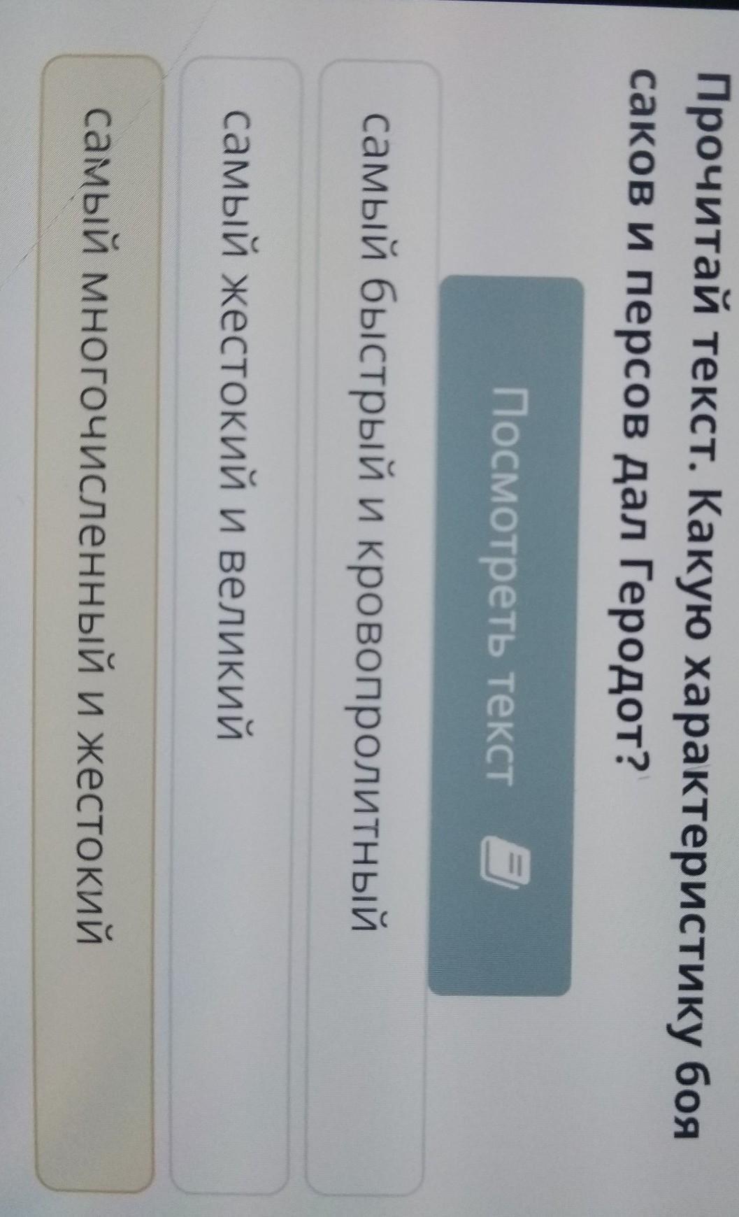 Легендарная царица Томирис Прочитай текст. Какую характеристику боя саков и персов дал Геродот? Посмотреть текст самый многочисленный и жестокий самый жестокий и великий самый быстрый и кровопролитный