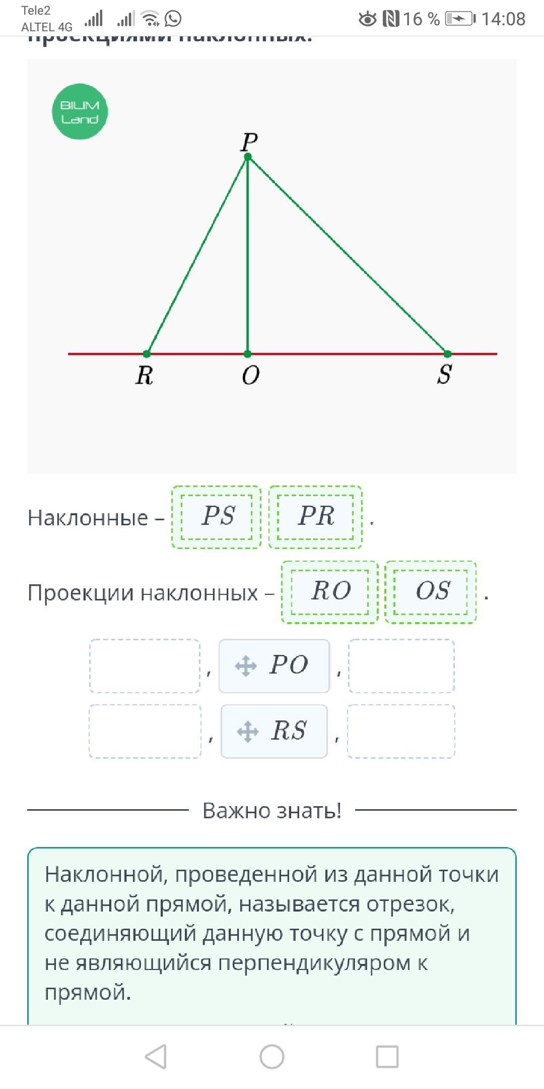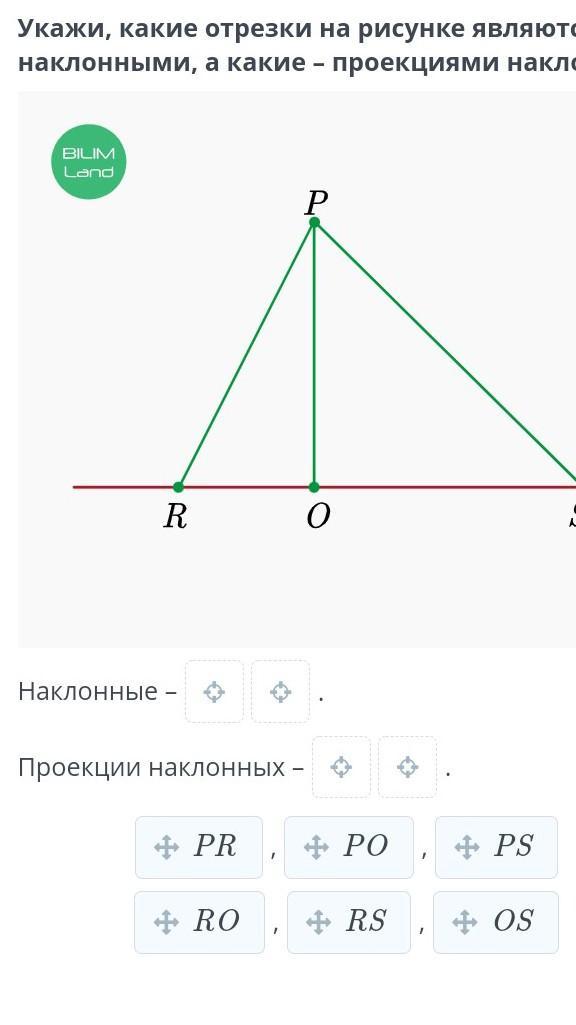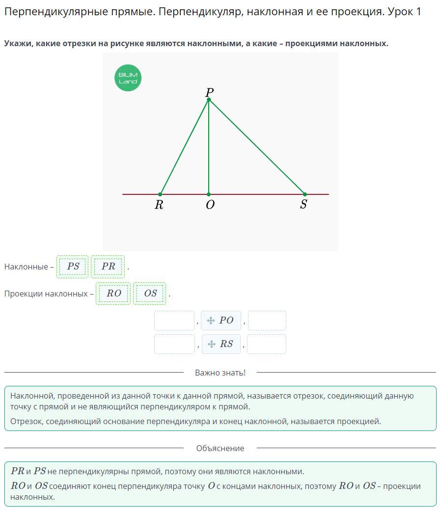 Перпендикулярные прямые. Перпендикуляр, наклонная и ее проекция. Урок 1 Укажи, какие отрезки на рисунке являются наклонными, а какие – проекциями наклонных.  Наклонные – . Проекции наклонных – . PR , PO , PS RO , RS ,
