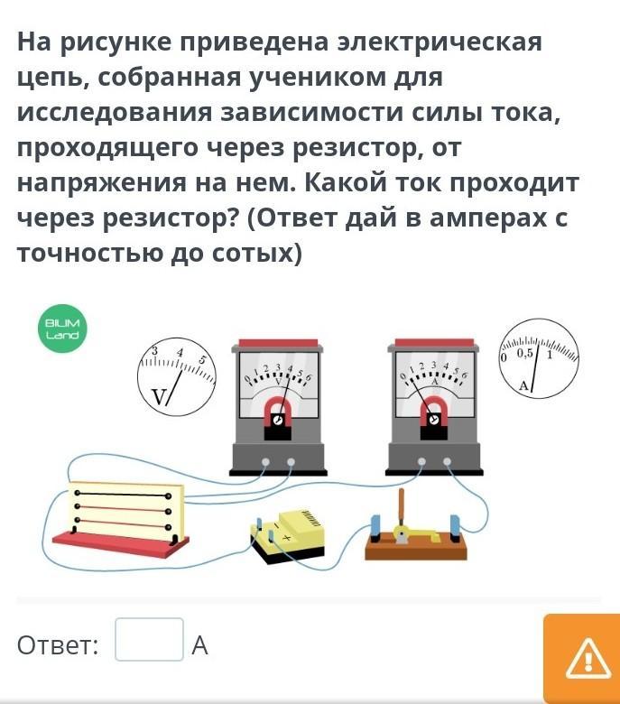 На рисунке приведена электрическая цепь, собранная учеником для исследования зависимости силы тока, проходящего через резистор, от напряжения на нем. Какой ток проходит через резистор? (Ответ дай в амперах с точностью до сотых)