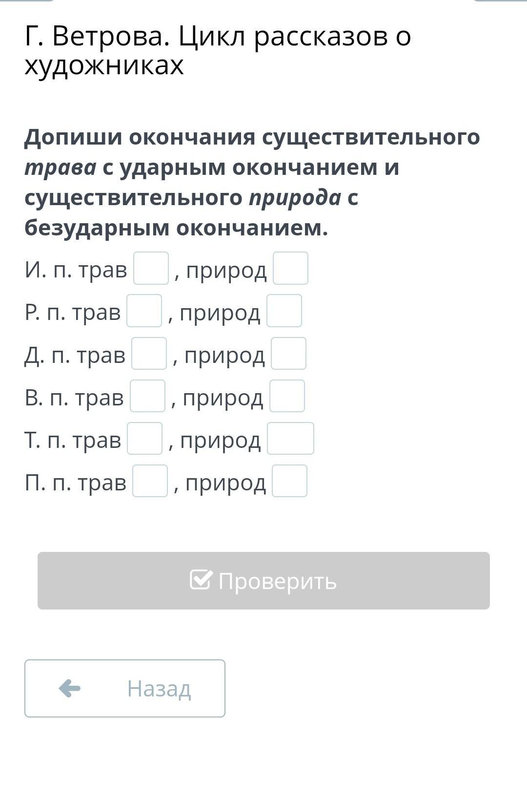 Допиши окончания существительного трава с ударным окончанием и существительного природа с безударным окончанием. И. п. трав , природ Р. п. трав , природ Д. п. трав , природ В. п. трав , природ Т. п. трав , природ П. п. трав , природпожалуйста помогите
