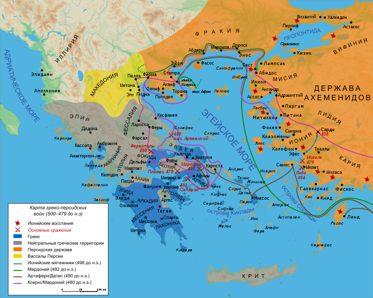 Плииз контурная карта "Греко-Персидские войны"!! Покажите направления войск Дария в Грецию Направления войск Ксеркса Места важнейших сражений греко-персидских войн + Рядом напишите из даты и названия местностей, где произошли сражения