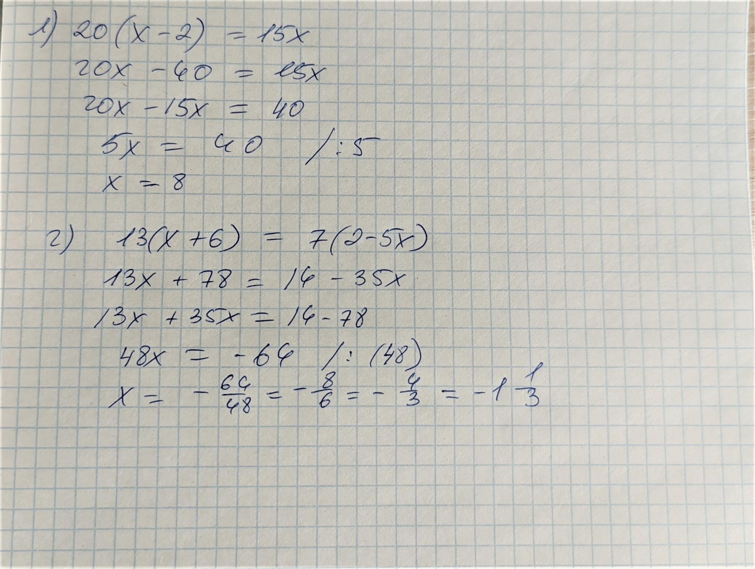 20(x-2)=15x 20x-40=15x 20x-15x=40 5x=40 x=40:5 x=8 Ответ: 8. 13(x+6)=7(2-5x) 13x+78 14-35x 13x+35x=14-78 48x = -64 x=-64:48 64 48 X= 4 3 x= x=-1. 1 ответ;не знаю? кто поможет дам 50балоов только быстро