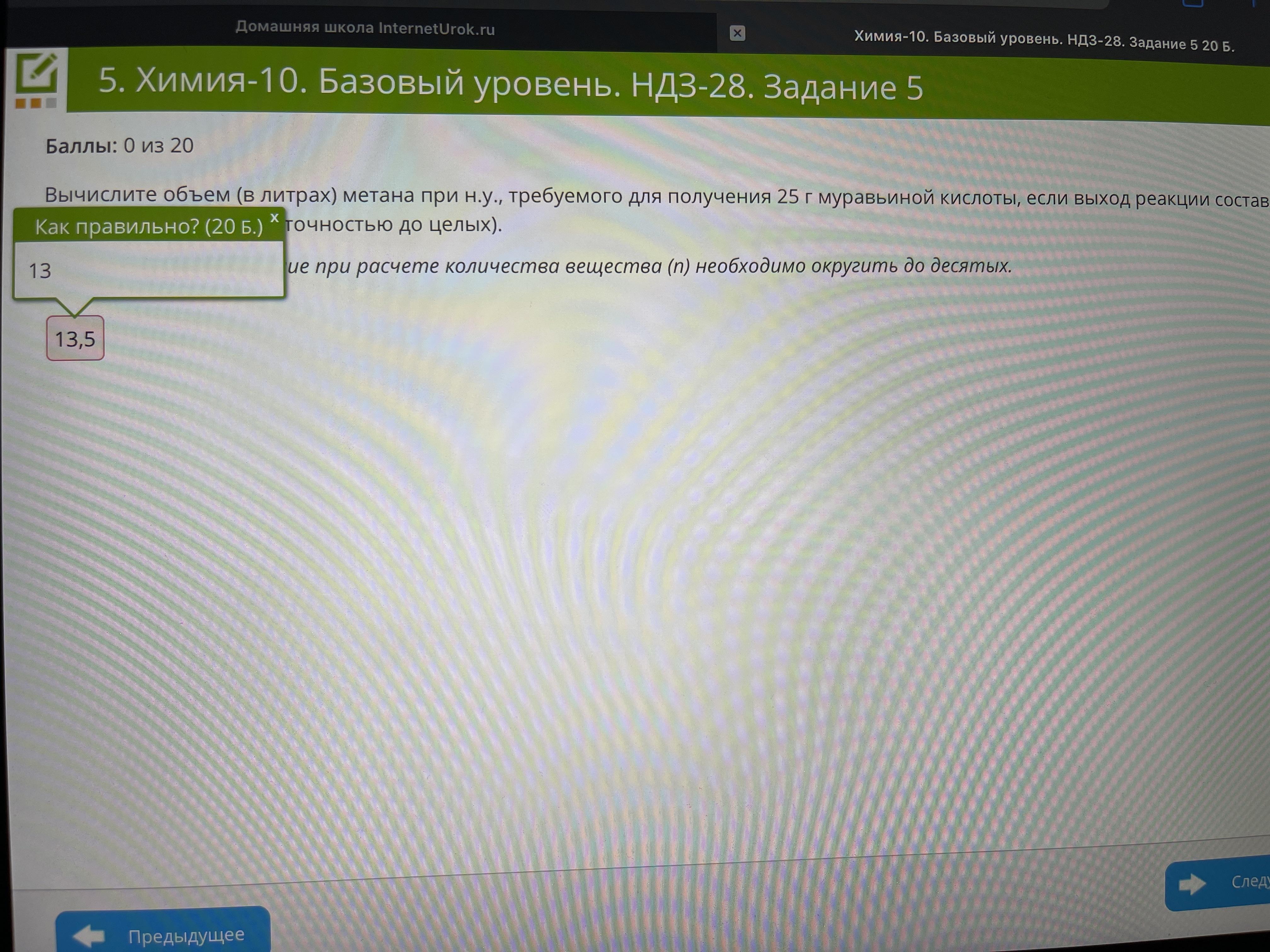 Вычислите объем (в литрах) метана при н.у., требуемого для получения 25 г муравьиной кислоты, если выход реакции составляет 90% (ответ запишите с точностью до целых). Промежуточное значение при расчете количества вещества (n) необходимо округить до десятых.