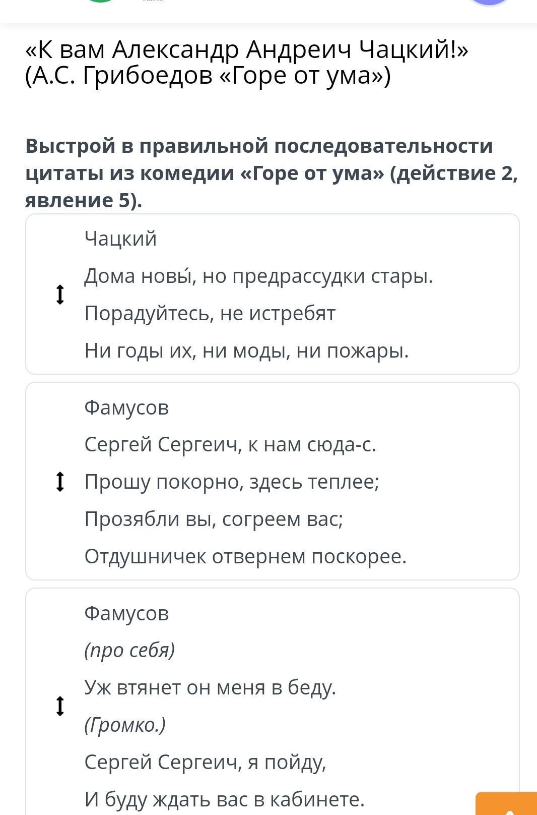 К вам Александр Андреич Чацкий!» (А.С. Грибоедов «Горе от ума») Выстрой в правильной последовательности цитаты из комедии «Горе от ума» (действие 2, явление 5). Чацкий Дома новы́, но предрассудки стары. Порадуйтесь, не истребят Ни годы их, ни моды, ни пожары. Фамусов Сергей Сергеич, к нам сюда-с. Прошу покорно, здесь теплее; Прозябли вы, согреем вас; Отдушничек отвернем поскорее. Фамусов (про себя) Уж втянет он меня в беду. (Громко.) Сергей Сергеич, я пойду, И буду ждать вас в кабинете.