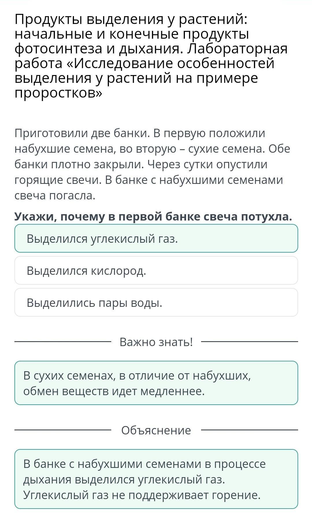 Приготовили две банки. В первую положили набухшие семена, во вторую – сухие семена. Обе банки плотно закрыли. Через сутки опустили горящие свечи. В банке с набухшими семенами свеча погасла. Укажи, почему в первой банке свеча потухла. Выделился Кислород. Выделился углекислый газ. Выделились пары воды.