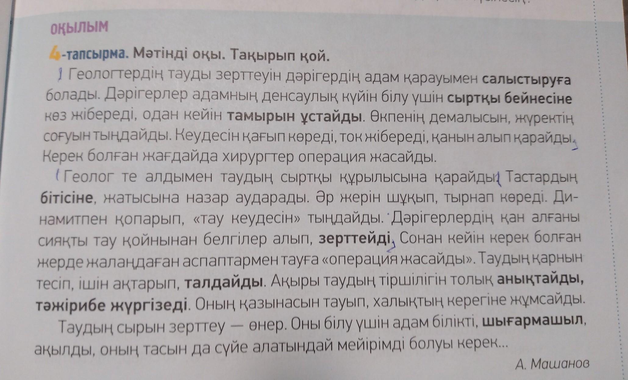 9-тапсырма. Геологке қойылатын талаптарды қазақ тіліне аудар. Бұл мамандықтың ерекшелігін айт. Требования к геологу: высшее образование; опыт составления геофизических и геохимических планов: знание порядка и технологии производства геологоразведочных работ знание законодательной базы, касающейся производства геологичес- Ких работ; . знание методов подсчета запасов твердых полезных ископаемых; знание таких программ, как AutoCad, CorelDraw, ArcMap, Micromine Gems. опыт полевых работ; знание государственного языка. Пожалуйста помогите по тексту текст в закрепе