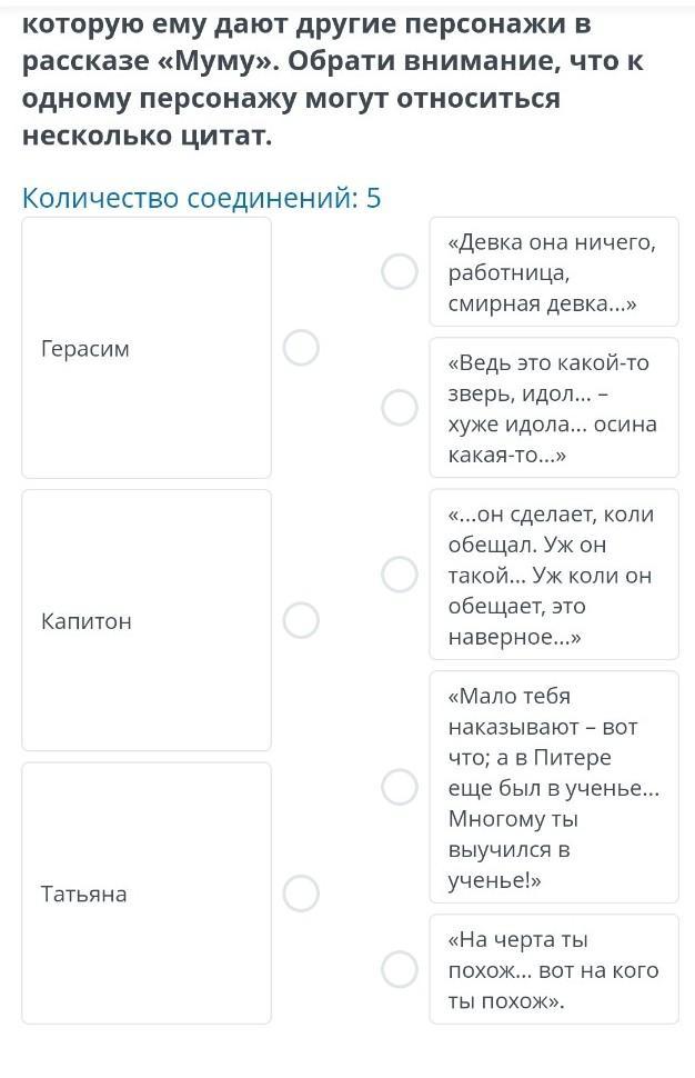 соедини персонажа с характеристикой, которую ему дают другие персонажи в рассказе «Муму». Обрати внимание, что к одному могут относиться несколько цитат.