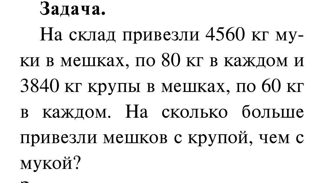 крупы всего 3840 кг, в один пакет вмещается 60кг, следовательно 3840/60=64 мешка с крупой