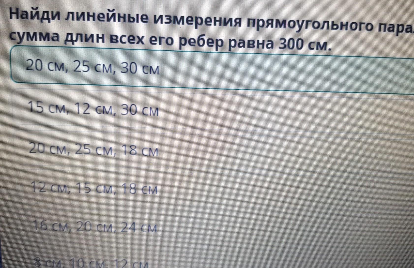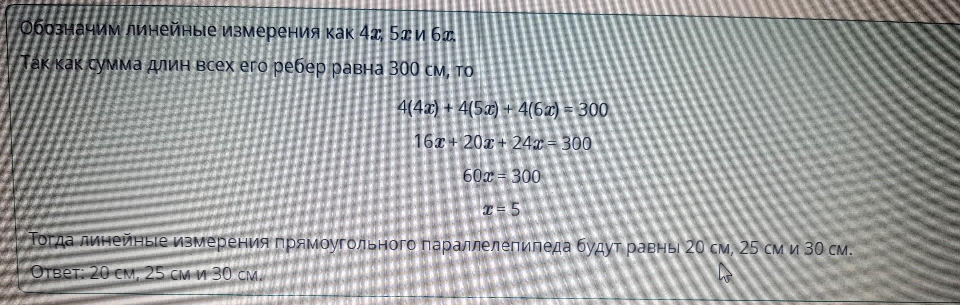 найди линейные измерения прямоугольного параллелепипеда которые относятся как 4:5:6, если сумма длин всех его ребер 300см