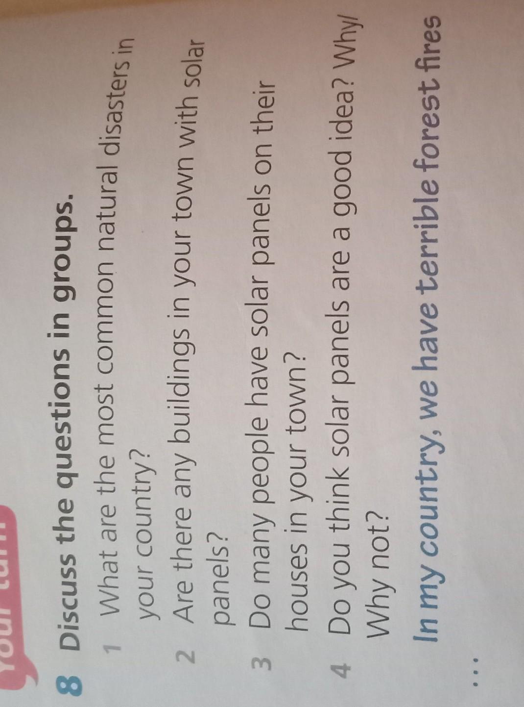 There are different disasters in different places in my country. In Almaty, the city where I live, there are earthquakes most often, because there are mountains near Almaty. We have solar panels in the city, but as for me, this is not the best idea, since in order for them to give a lot of electricity, a fairly large area is needed.