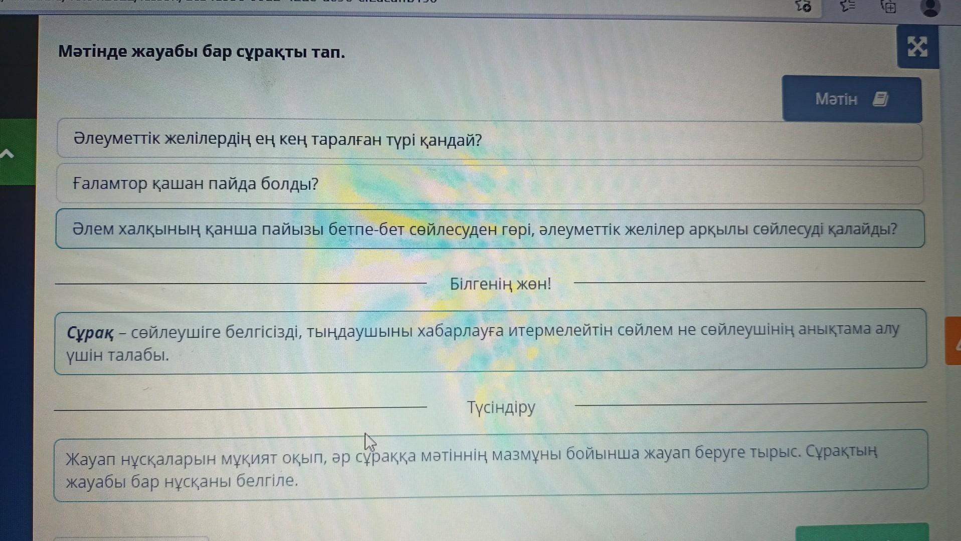 Ғаламтордың пайдасы мен зияны Мәтінде жауабы бар сұрақты тап. Әлем халқының қанша пайызы бетпе-бет сөйлесуден гөрі, әлеуметтік желілер арқылы сөйлесуді қалайды? ғаламтор қашан пайда болды? Әлеуметтік желілердің ең кең таралған түрі қандай?