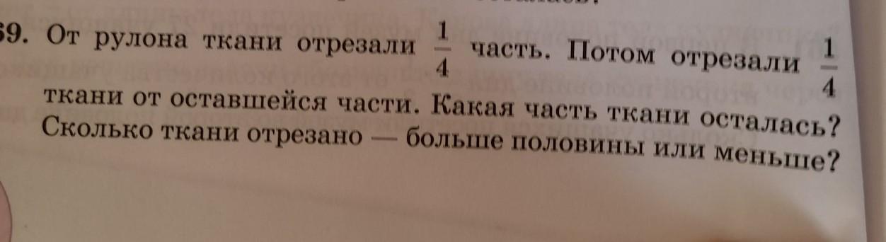 Б. 1 1 569. От рулона ткани отрезали 1/4 часть. Потом отрезали 1/ 4 ткани от оставшейся части. Какая часть ткани осталась? Сколько ткани отрезано больше половины или меньше?