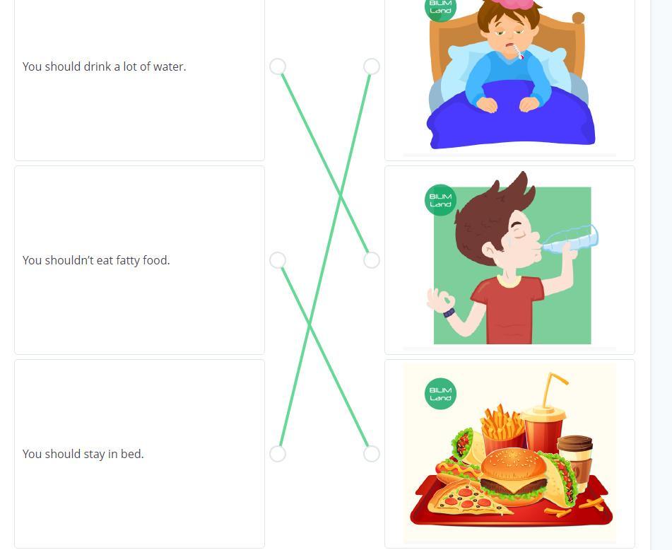 Professional treatment Match the pictures to the correct statements. » Number of connections: 3 You should drink a lot of water. You shouldn't eat fatty food. EL You should stay in bed.