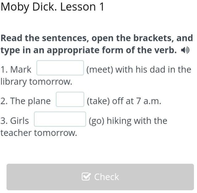 1. Mark (meet) with his dad in the library tomorrow. 2. The plane (take) off at 7 a.m. 3. Girls (go) hiking with the teacher tomorrow.