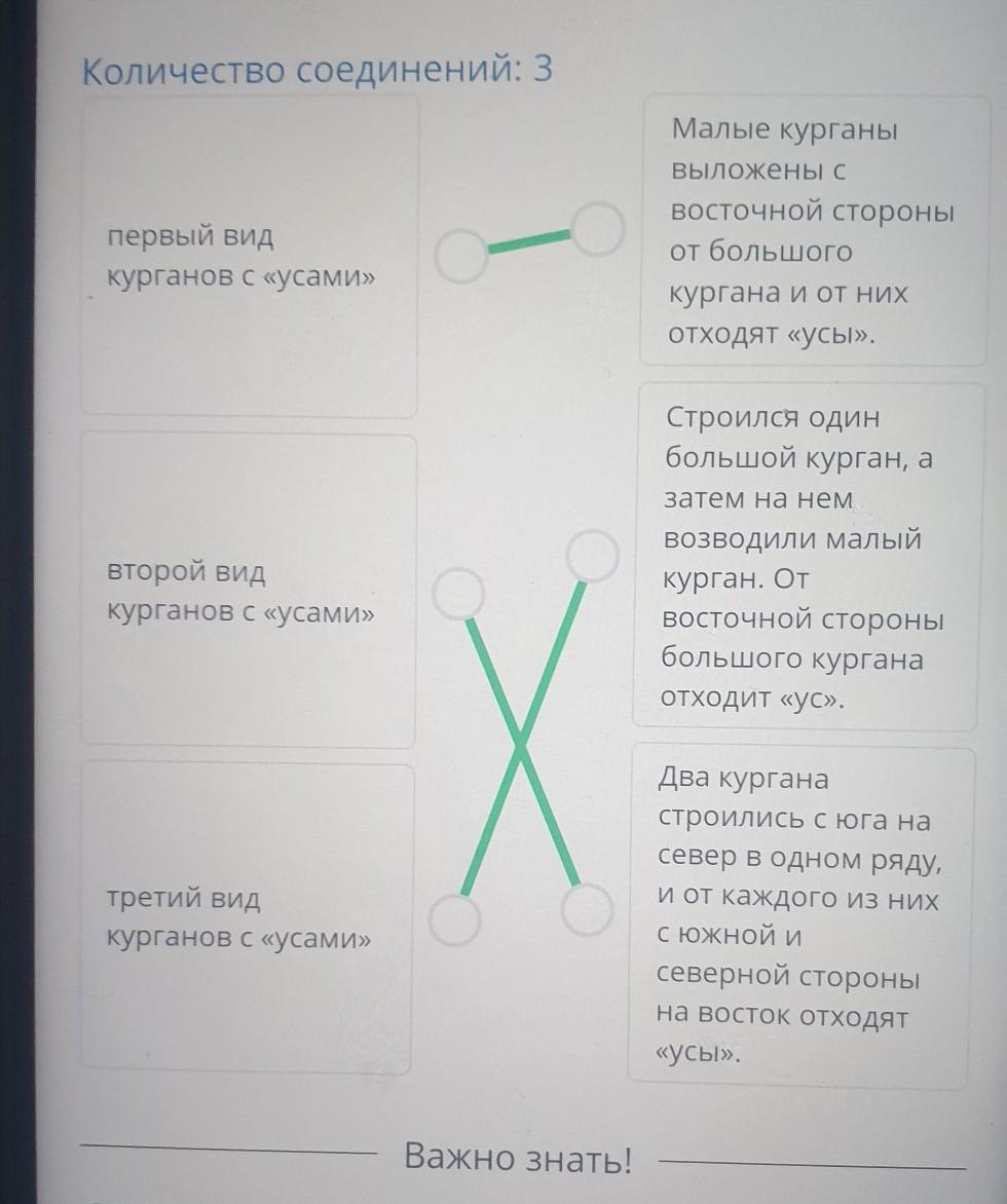 культура. Урок 1 Соотнеси вид кургана с «усами» и его особенность. Количество соединений: 3 первый вид курганов с сусами» Малые курганы Выложены с восточной стороны от большого кургана и от них отходят «усы». Второй вид курганов С «усами» Строился один большой курган, а затем на нем возводили малый курган. От восточной стороны большого кургана отходит «ус». третий вид курганов с «усами» Два кургана строились с юга на север в одном ряду, и от каждого из них с южной и северной стороны на восток отходят тусы.
