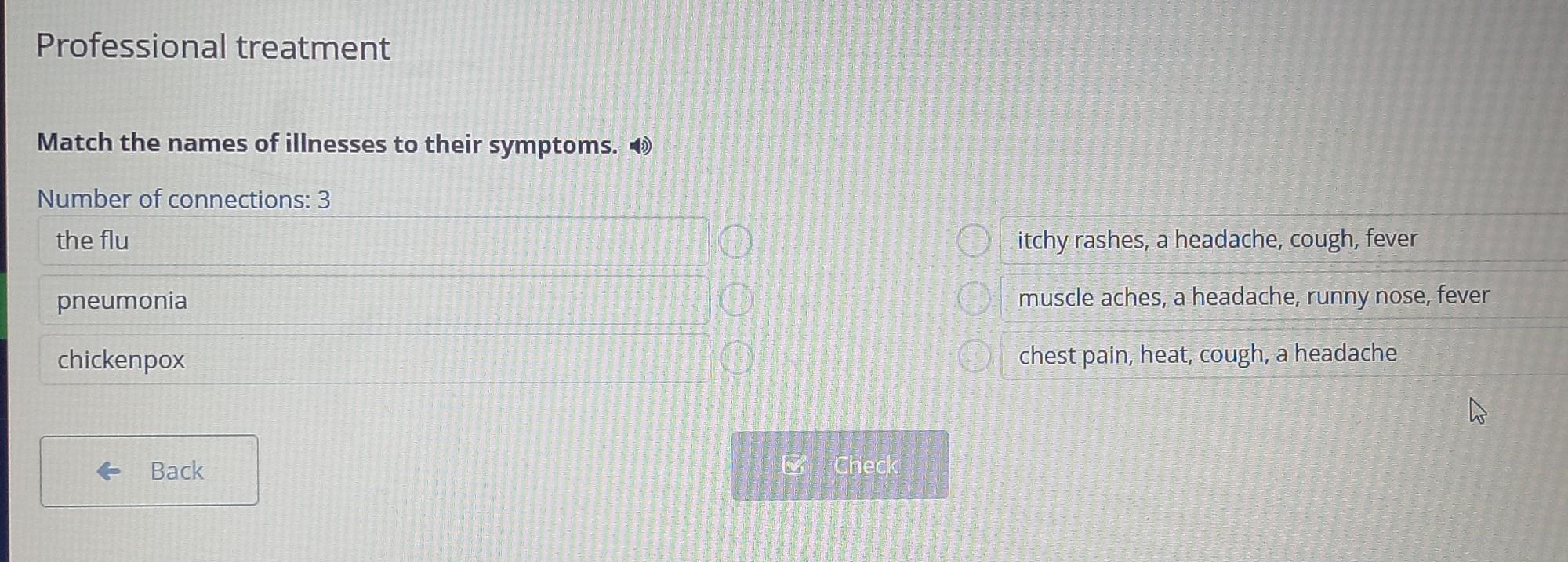 Professional treatment Match the names of illnesses to their symptoms. 1) Number of connections: 3 the flu LO itchy rashes, a headache, cough, fever pneumonia muscle aches, a headache, runny nose, fever chickenpox chest pain, heat, cough, a headache, помогитее срочно
