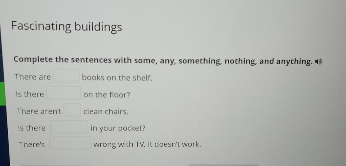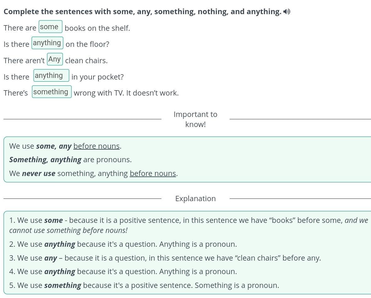 Complete the sentences with some, any, something, nothing, and anything. There are books on the shelf. Is there on the floor? There aren't clean chairs. Is there in your pocket? There's wrong with TV. It doesn't work.