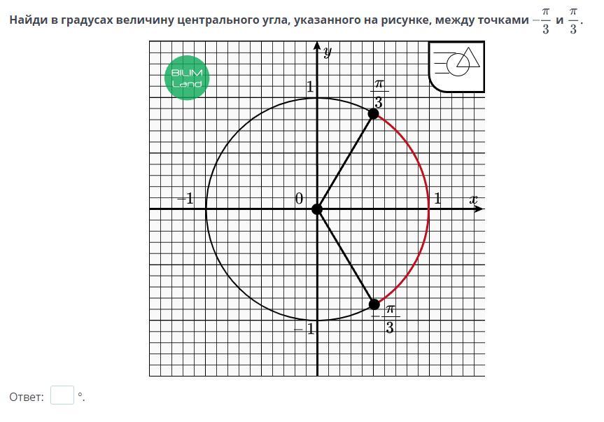 Найди в градусах величину центрального угла, указанного на рисунке, между точками -пи/3 и пи/3