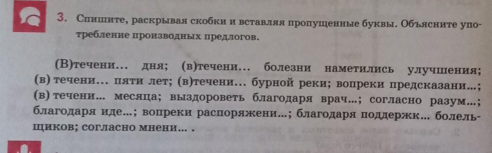 3. Спишите, раскрывая скобки и вставляя пропущенные буквы. Объясните упо- требление производных предлогов. (В)течени... дня; дня; (в)течени... болезни наметились улучшения; (в) течени... пяти лет; (в)течени... бурной реки; вопреки предсказани...; (в) течени... месяца; выздороветь благодаря врач...; согласно разум...; благодаря иде...; вопреки распоряжени...; благодаря поддержк... болель- щиков; согласно мнени... .