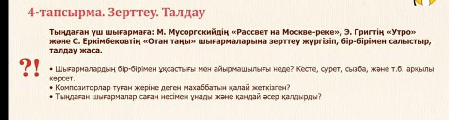 Задание 4. исследования. проведи исследование, сравни, проанализируй три произведения, прослушанные на анализ: «рассвет на москве-реке» М. Мусоргского, «утро» Э. Грига и «Утро Родины» с.кімимбекова. * в чем сходство и различие произведений между собой? покажи через таблицу, рисунок, схему и т.д. * как композиторы передали свою любовь к родной земле? чем вам понравились прослушанные произведения и какое впечатление они произвели на вас?