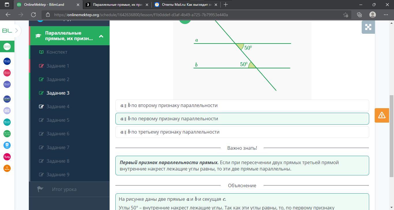 Параллельные прямые, их признаки и свойства. Урок 2 Используя рисунок, определи, по какому признаку параллельны данные прямые.  a ∥ b по первому признаку параллельности a ∥ b по третьему признаку параллельности a ∥ b по второму признаку параллельности Назад Проверить