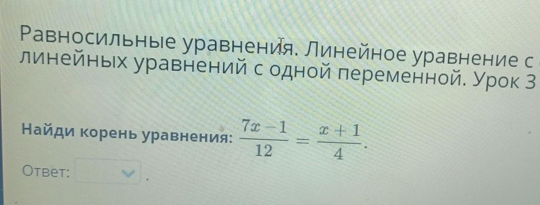 Равносильные уравнения. Линейное уравнение с одной переменной. Решение линейных уравнений с одной переменной. Урок 3 7х-1/12=х+1/4
