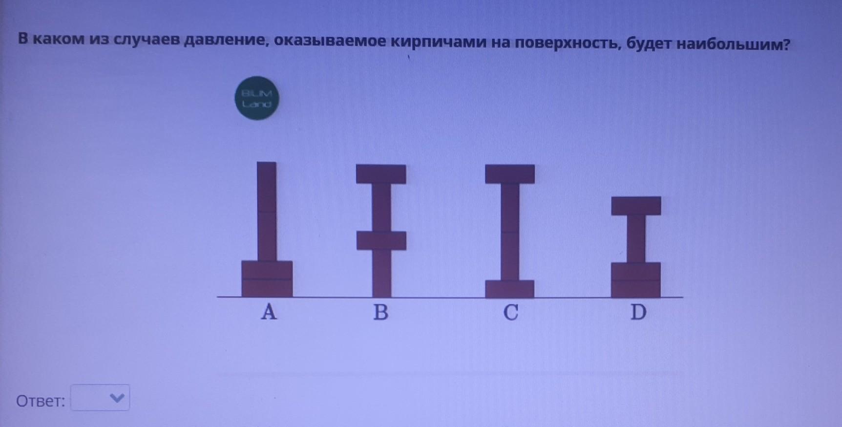В каком из случаев давление, оказываемое кирпичами на поверхность, будет наибольшим? A B D С D