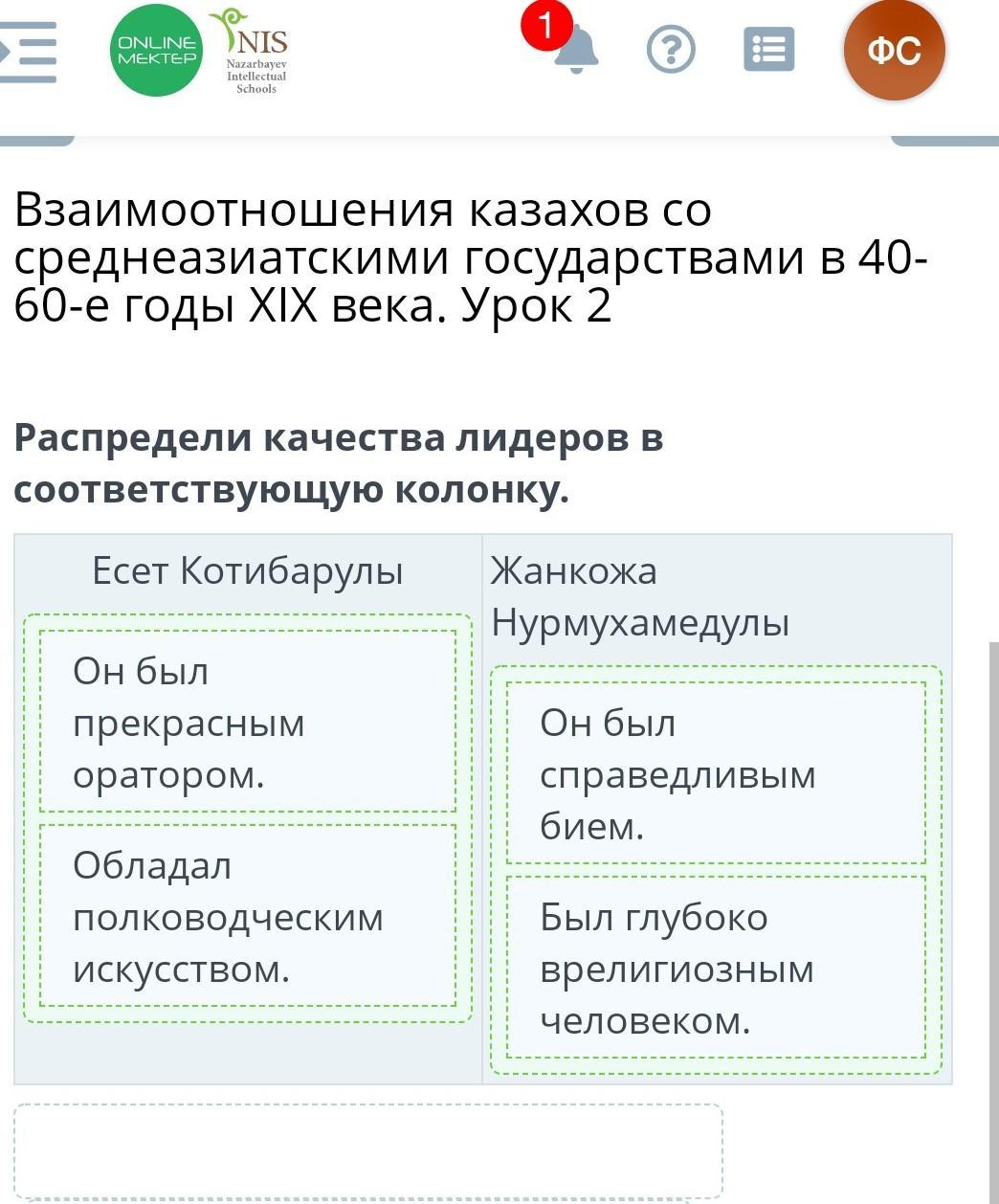 Распредели качества лидеров В соответствующую колонку. Есет Котибарулы Жанкожа Нурмухамедулы Он был прекрасным оратором. + Он был справедливым бием. + Был глубоко врелигиозным человеком. + Обладал полководческим искусством