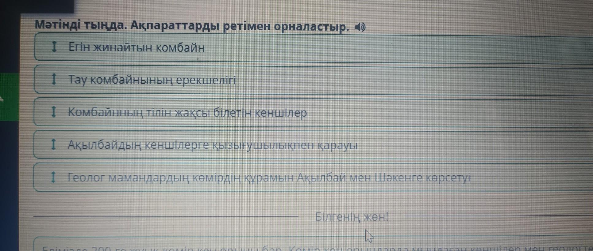 Мәтінді тыңда. Ақпараттарды ретімен орналастыр. ) Т Егін жинайтын комбайн 1 Комбайнның тілін жақсы білетін кеншілер І Тау комбайнының ерекшелігі І Ақылбайдың кеншілерге қызығушылықпен қарауы Геолог мамандардың көмірдің і құрамын Ақылбай мен Шәкенге көрсетуі Tekceny