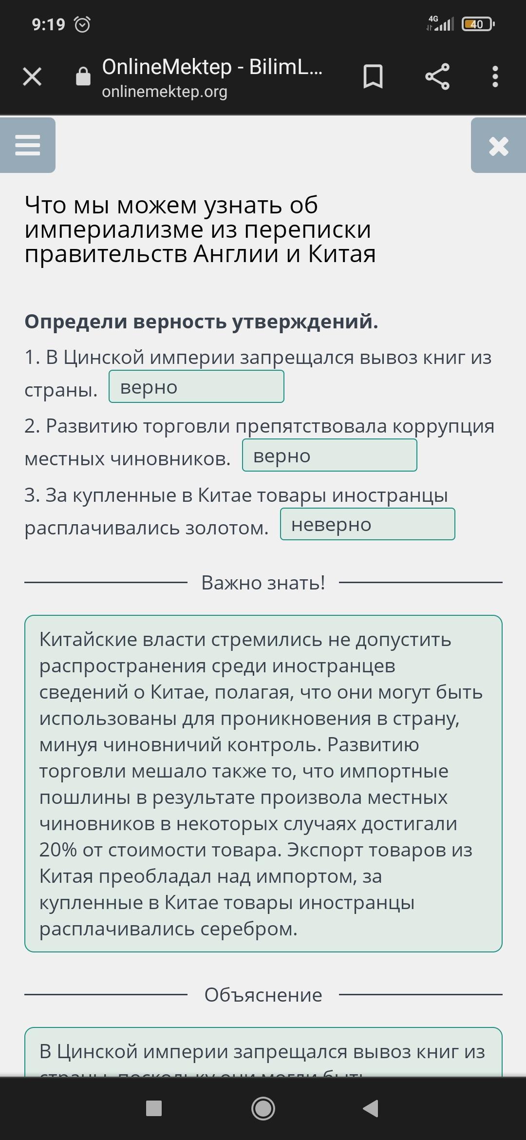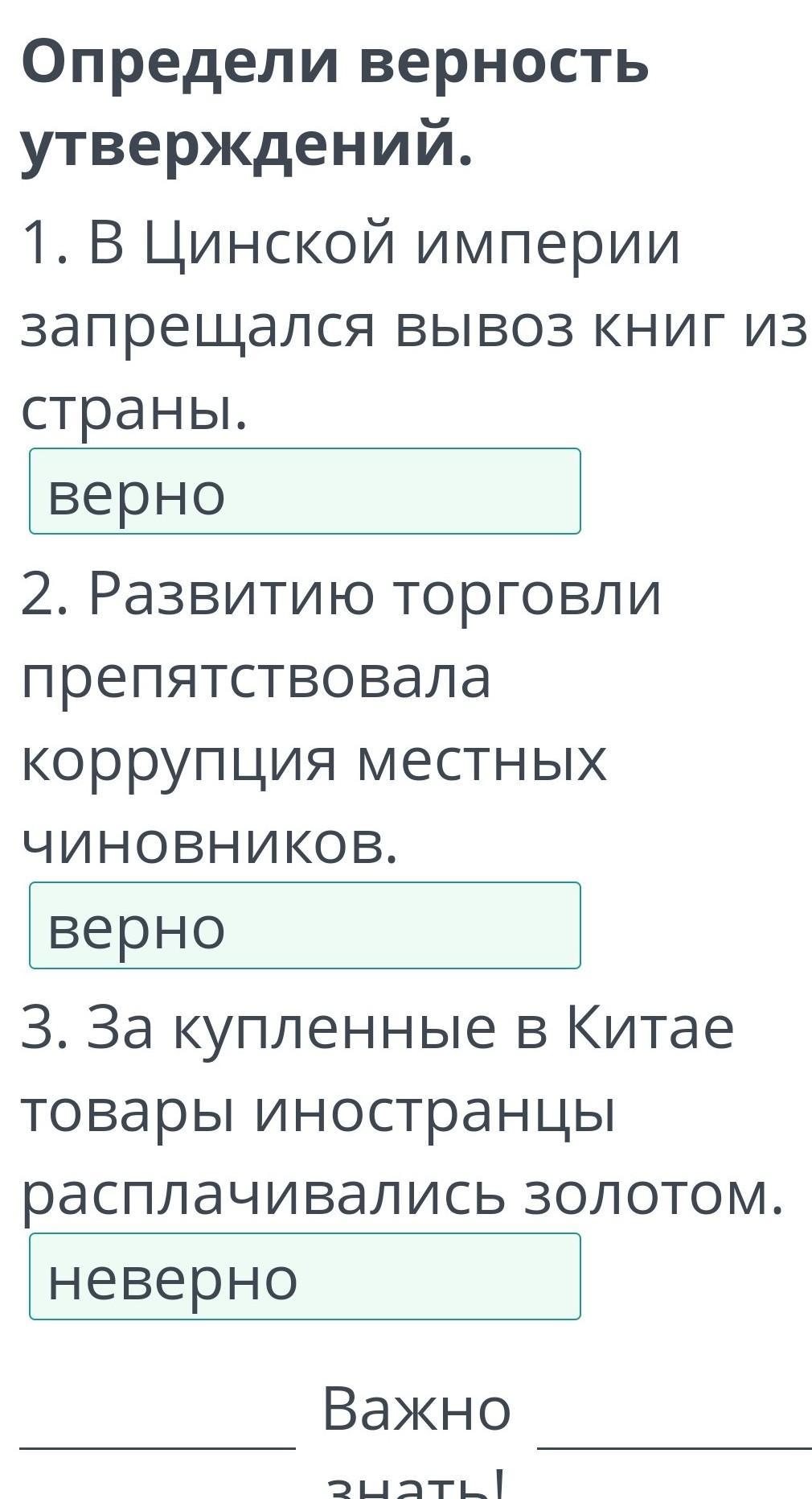 Определи верность утверждений. 1. В цинской империи запрещался вывоз книг из страны. 2. Развитию торговли препятствовала коррупция местных чиновников. 3. За купленные в Китае товары иностранцы расплачивались золотом.