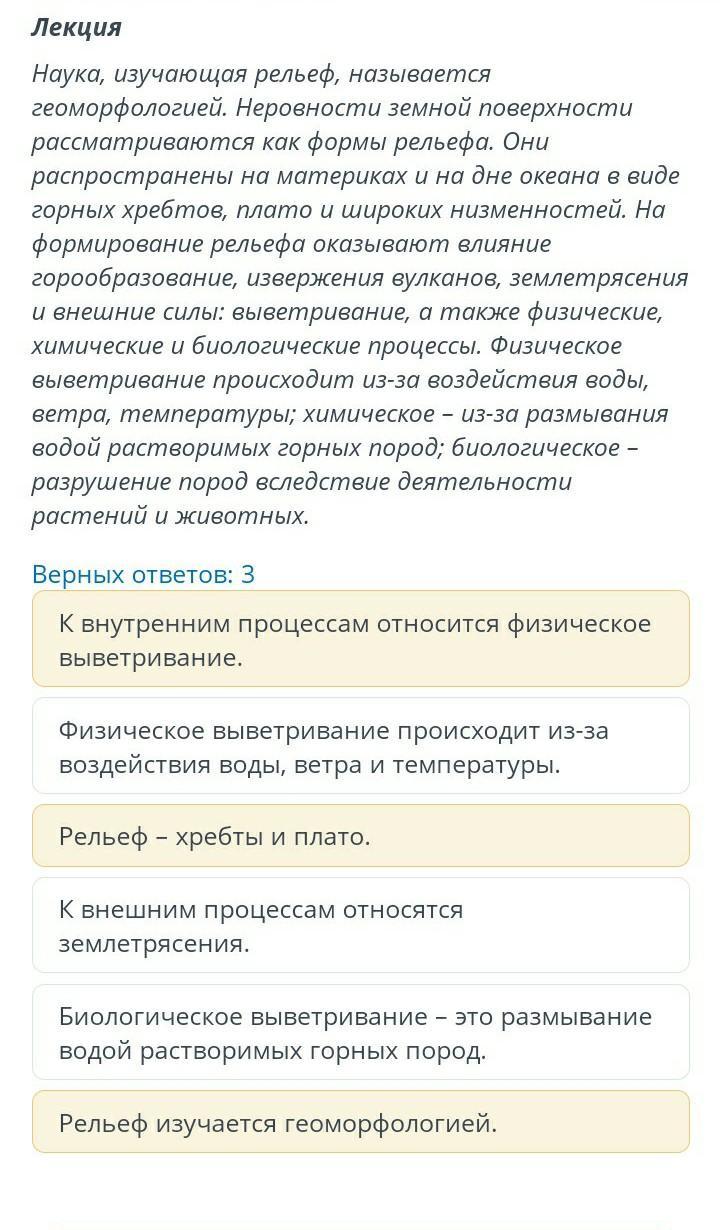 1)К внутренним процессам формирования рельефа относятся горообразование, извержения вулканов и землетрясения.