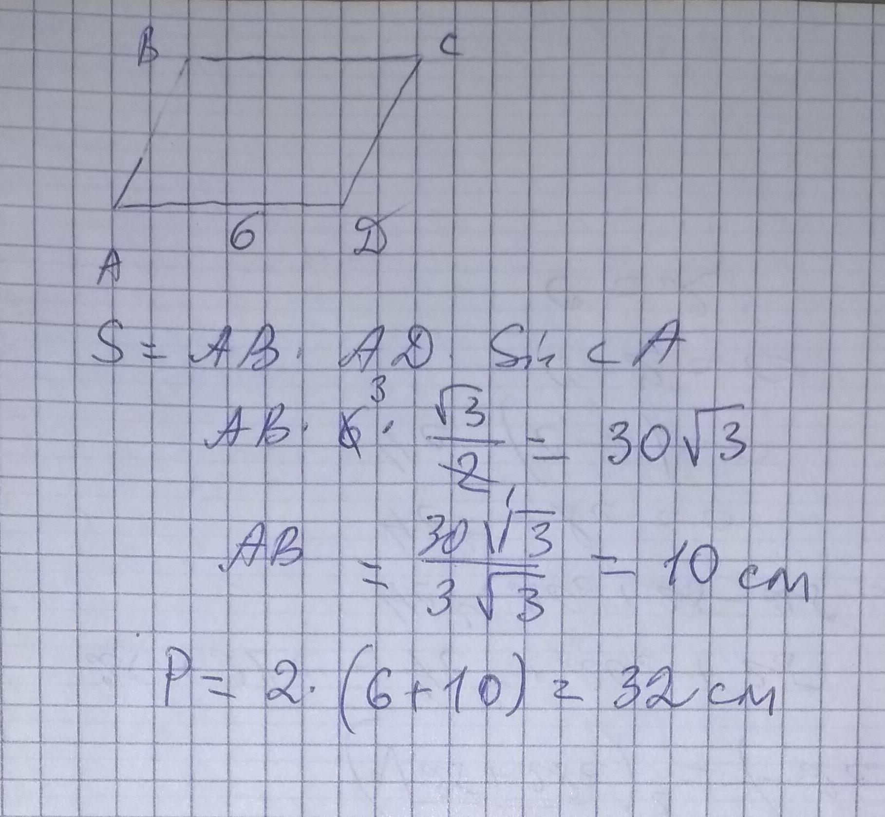 площадь параллелограма равна 30√3 см², а один из углов равен 60°. Найдите его периметр, если длина одной из сторон равна 6см