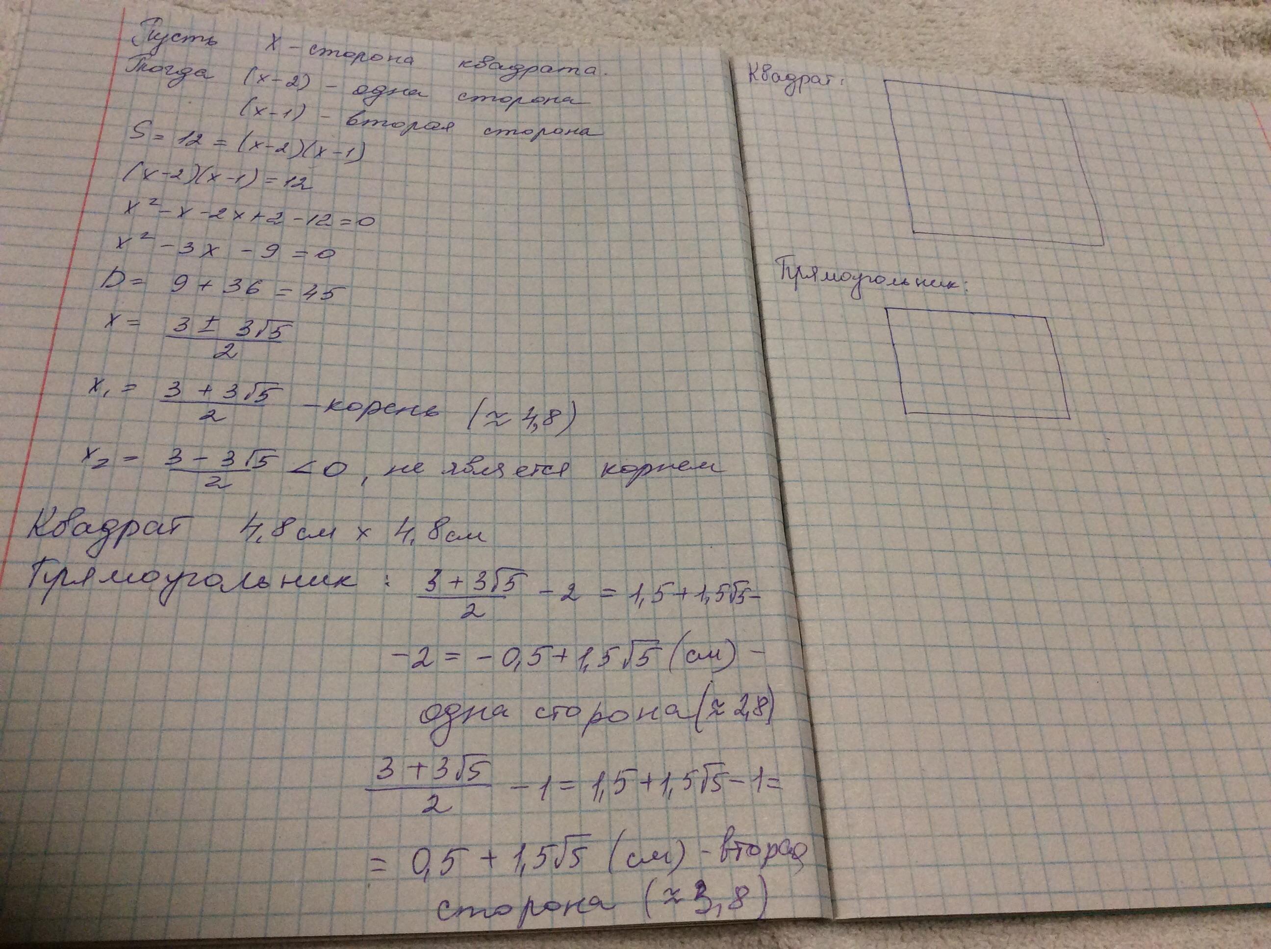 Одну сторону квадрата уменьшили на 2 см а другую на 1 и получили прямоугольник С площадью 12 см в квадрате найдите длину стороны квадрата изобразите квадрат и прямоугольник