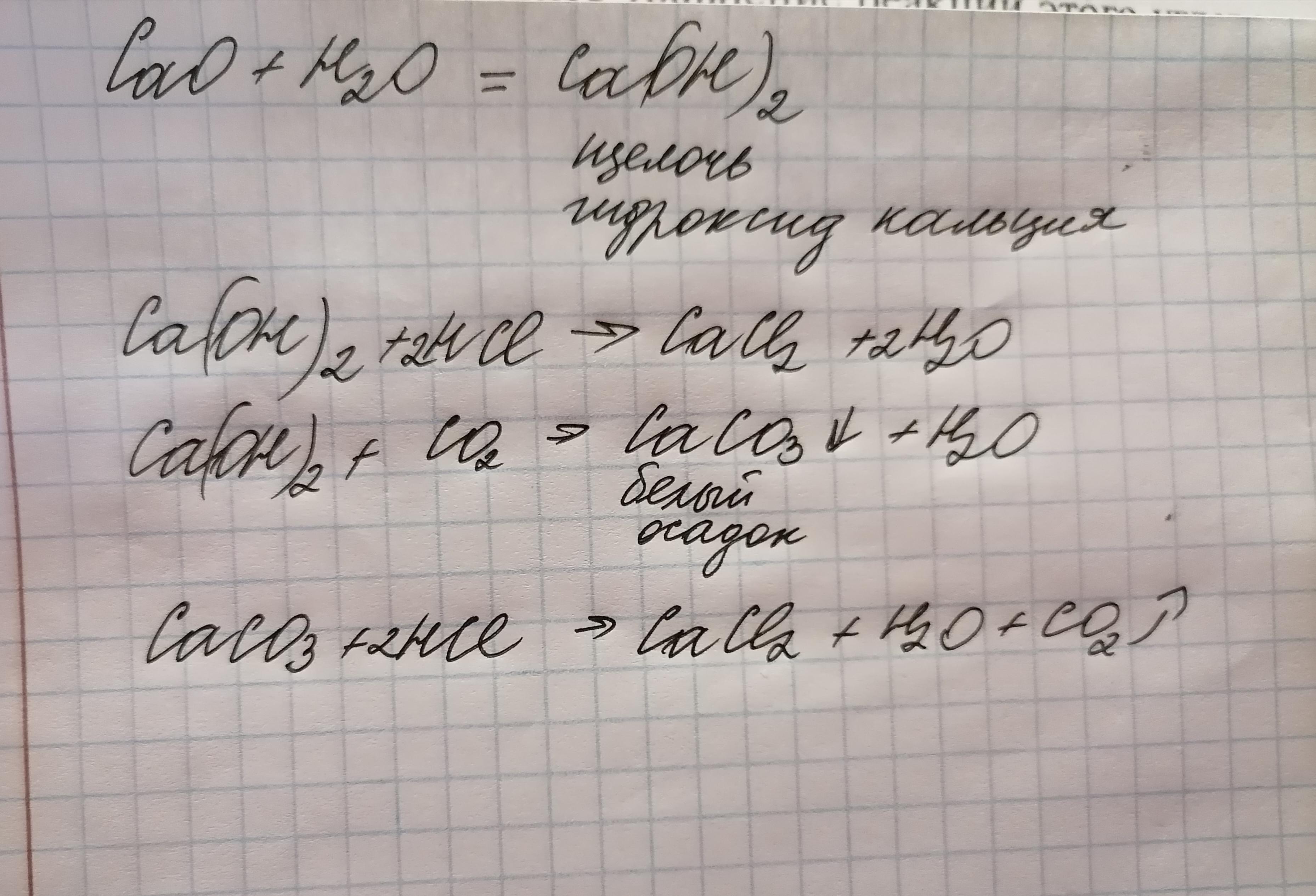 мы взяли негашеную известь CaO (оксид кальция) и погасили ее водой. Отстоявшийся раствор содержит продукт взаимодействия оксида кальция с водой и обладает способностью изменять цвет индикатора, показывая щелочную реакцию. Почему? Что это за вещество? Напишите уравнение реакции гашения извести. Это вещество реагирует с соляной кислотой. Напишите уравнение реакции. Это вещество реагирует с углекислым газом. Напишите уравнение реакции. При реакции с углекислым газом образуется нерастворимый белый осадок. Он тоже реагирует с соляной кислотой (растворяется). Напишите уравнение реакции. Цепочка химических превращений: 1) СаO + Н2O = Х (вещество 1) 2) Х (вещество 1) + НСl = ? 3) Х (вещество 1) + СО2 = Y (вещество 2) 4) Y (вещество 2) + НСl = ?
