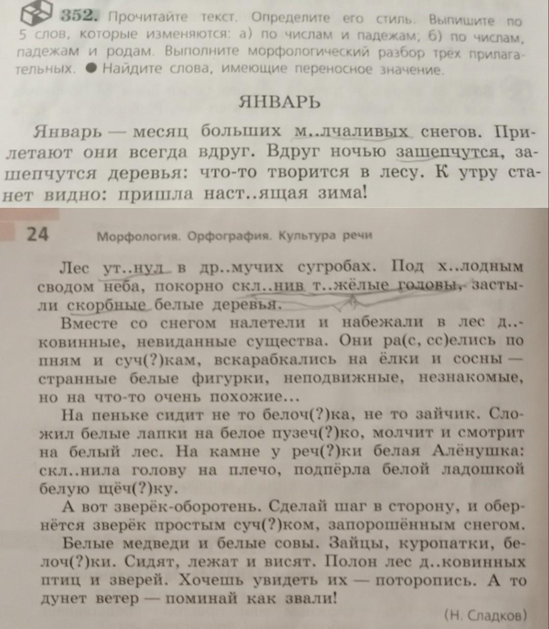 б) по числам, падежам и родам: белую, (под) холодным, настоящая, простым,