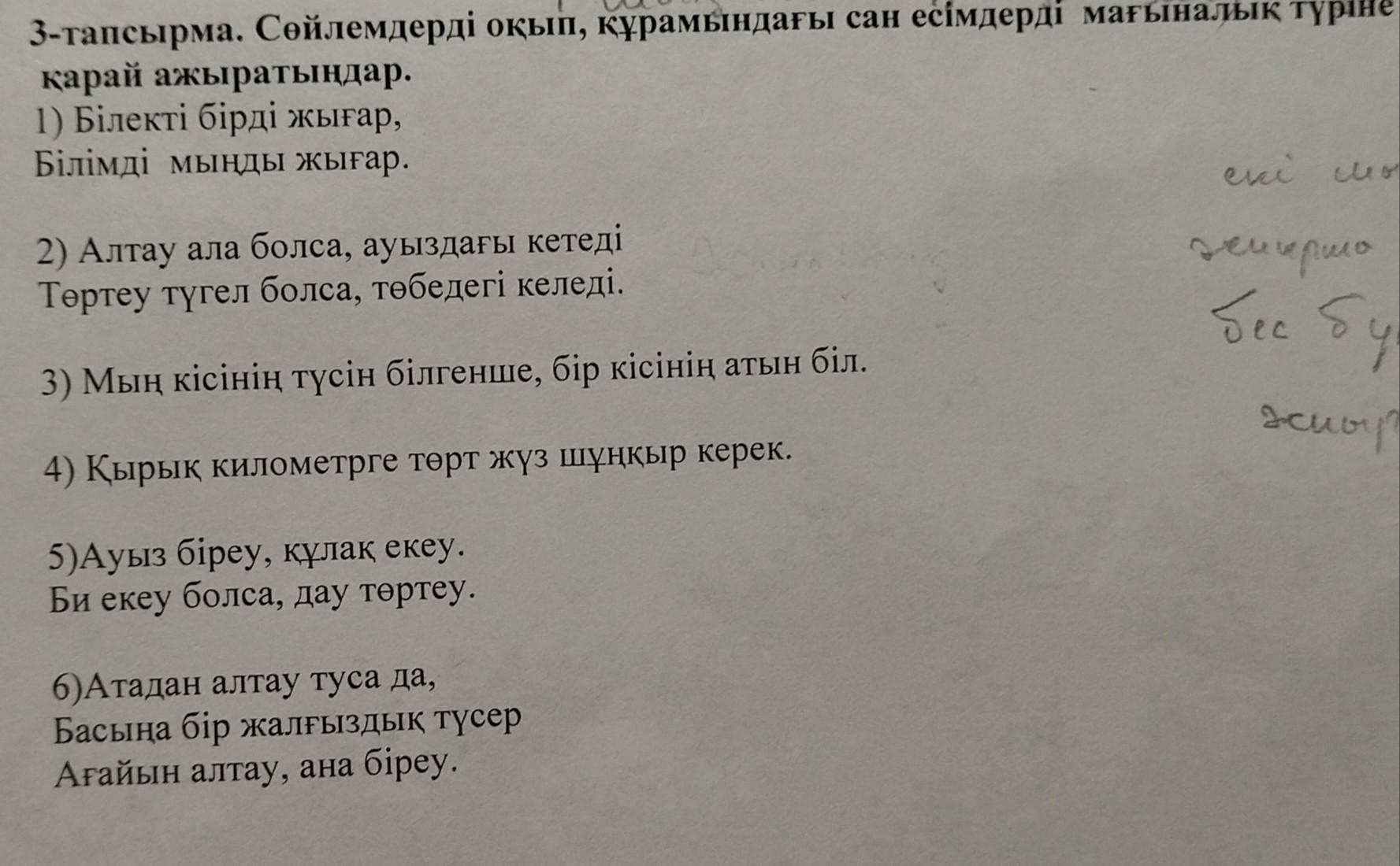 3-тапсырма. Сөйлемдерді оқып, құрамындағы сан есімдерді мағаналық түріне қарай ажыратыңдар.