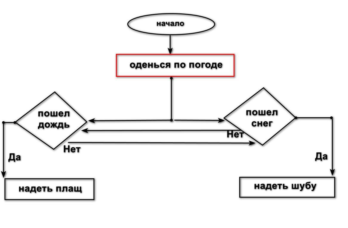 Составить блок-схему алгоритма "Оденься по погоде". При условии, что, если пойдёт дождь, то надену плащ, если снег - шубу.